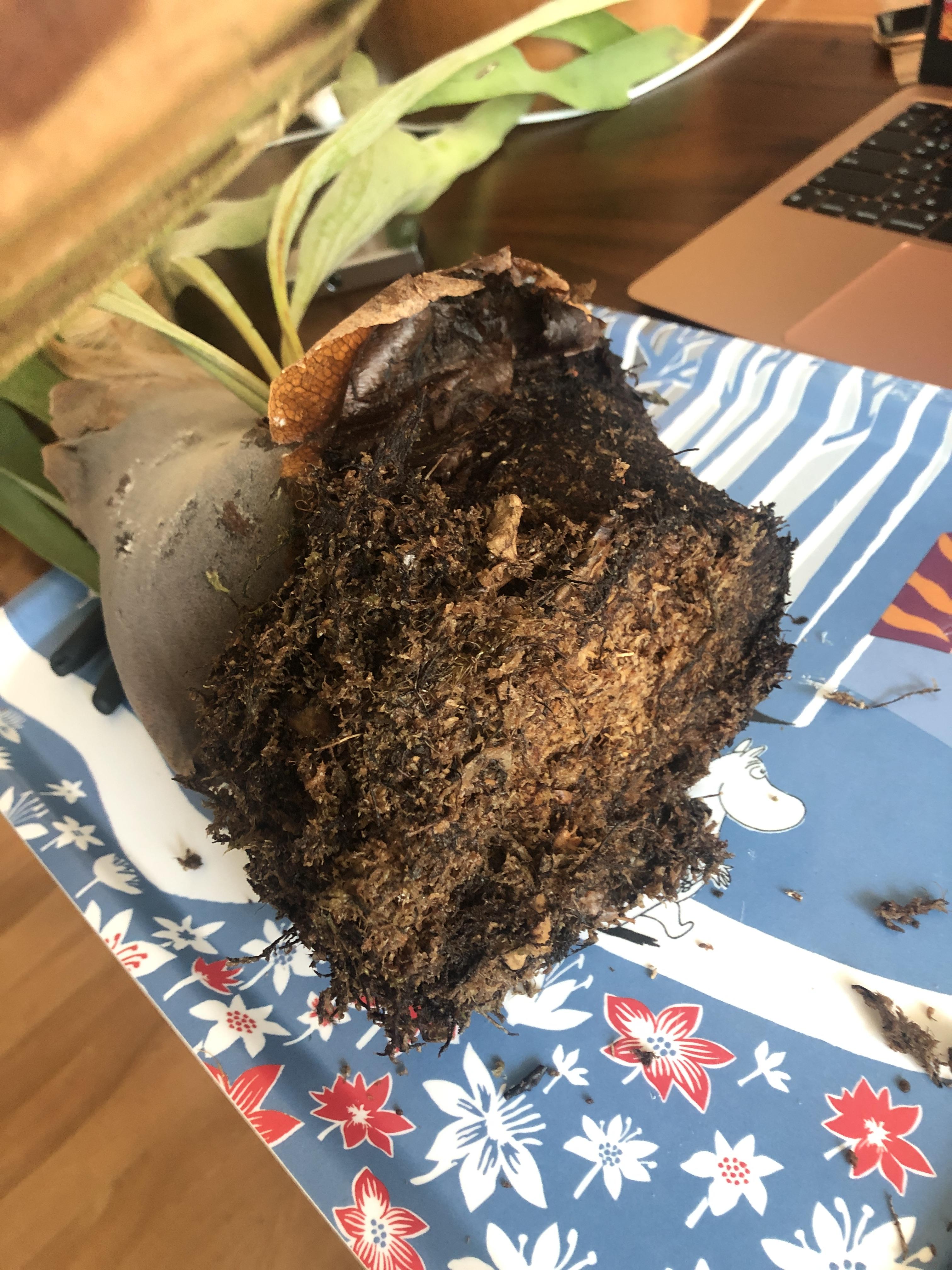 뜯자마자 나타나는 거대하고 웅장한 자태를 가졌을 것 같은 신문지에 돌돌 말린 박쥐란입니다. 이정도의 박쥐란 + 유목 활착된 것을 양재 화훼단지에서 가격을 물어봤을 때 얼추 8만원 이상하던데요. 사실 비슷한 것 같습니다. 저는 박쥐란 3만원 가량에 유목값이 5만원 들었거든요... 가끔 식물을 사다보면 화분이 식물보다 비싸지는 형국이 자주 도래합니다만, 행잉 식물에서 유목 값이 식물 값보다 비싸질 거라곤 상상 못했습니다.